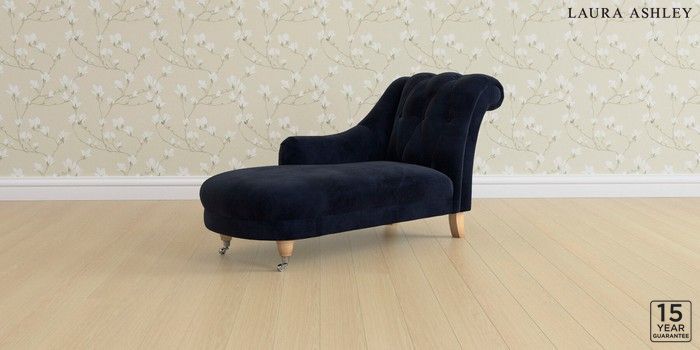 6.12.1 Buy Gloucester Button Back by Laura Ashley Chaise Longue Left Hand Orla Midnight Navy Low Chrome Castor - Light Oak from the Next UK online shop Click here to use our accessible website