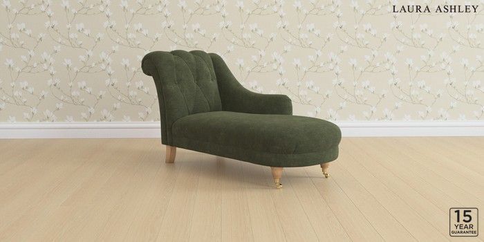 6.12.1 Buy Gloucester Button Back by Laura Ashley Chaise Longue Right Hand Alwyn Velvet Ivy Green Low Brass Castor - Light Oak from the Next UK online shop Click here to use our accessible website