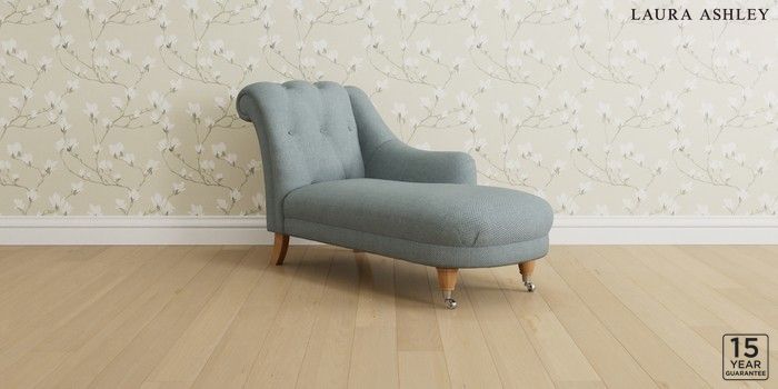 6.12.1 Buy Gloucester Button Back by Laura Ashley Chaise Longue Right Hand Anneliese Seaspray Blue Low Brass Castor - Light Oak from the Next UK online shop Click here to use our accessible website