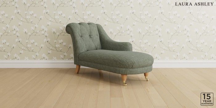 6.12.1 Buy Gloucester Button Back by Laura Ashley Chaise Longue Right Hand Bainton Sage Green Low Brass Castor - Light Oak from the Next UK online shop Click here to use our accessible website