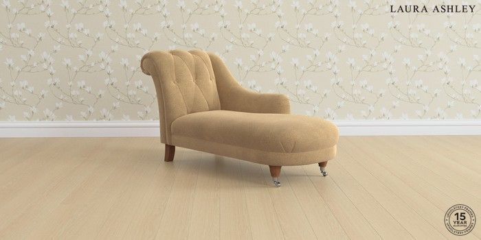 6.12.1 Buy Gloucester Button Back by Laura Ashley Chaise Longue Right Hand Lundar Chenille Caramel Natural Low Chrome Castor - Teak from the Next UK online shop Click here to use our accessible website