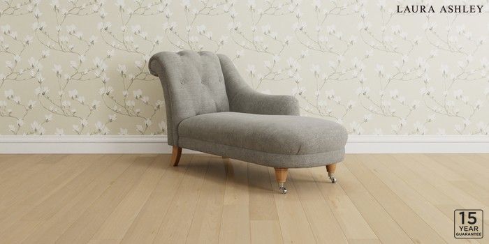 6.12.1 Buy Gloucester Button Back by Laura Ashley Chaise Longue Right Hand Orla Pale Steel Grey Low Brass Castor - Light Oak from the Next UK online shop Click here to use our accessible website