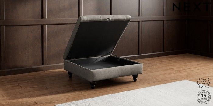 7.0.3 Buy Gosford Button Arm Leather Extra Large Storage Footstool Antiqued Leather Grey Low Turned - Dark from the Next UK online shop Click here to use our accessible website