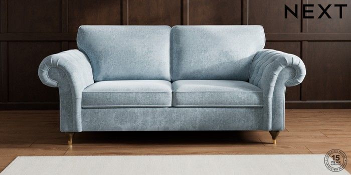 7.2.6 Buy Gosford Highback II Deep Sit 3 Seater Sofa Plush Chenille Light Blue Modern Turned Metal Cap - Mid from the Next UK online shop Click here to use our accessible website