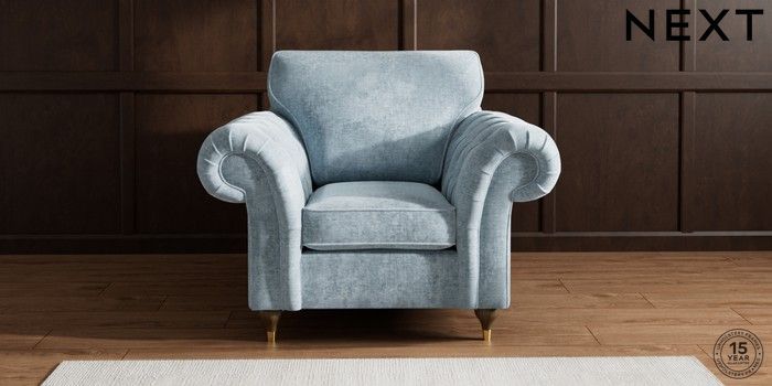 7.2.6 Buy Gosford Highback II Deep Sit Armchair Plush Chenille Light Blue Modern Turned Metal Cap - Mid from the Next UK online shop Click here to use our accessible website