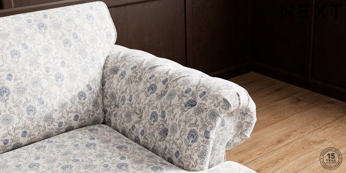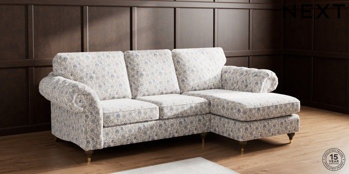 7.3.1 Buy Gosford Highback II Deep Sit Medium Sofa Chaise - Right Hand Relaxed Linen Look Print Woodblock Floral Blue Modern Turned Metal Cap - Mid from the Next UK online shop Click here to use our accessible website