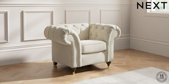 7.0.3 Buy Gosford II Deep Sit Armchair Luxe Chenille Oyster Modern Turned Metal Cap - Mid from the Next UK online shop Click here to use our accessible website