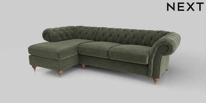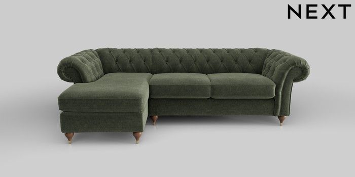 6.12.1 Buy Gosford II Deep Sit Medium Sofa Chaise - Left Hand Luxe Chenille Mid Green Modern Turned Metal Cap - Mid from the Next UK online shop Click here to use our accessible website