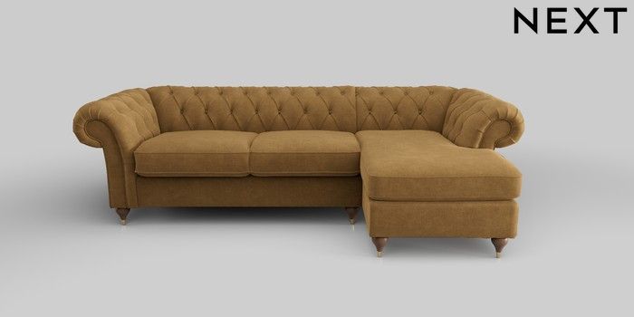 6.12.1 Buy Gosford II Deep Sit Medium Sofa Chaise - Right Hand Luxe Chenille Honey Yellow Modern Turned Metal Cap - Mid from the Next UK online shop Click here to use our accessible website