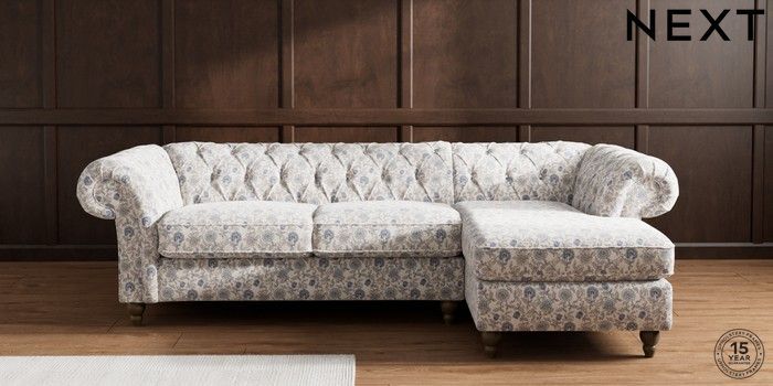 7.3.1 Buy Gosford II Deep Sit Medium Sofa Chaise - Right Hand Relaxed Linen Look Print Woodblock Floral Blue Low Turned - Mid from the Next UK online shop Click here to use our accessible website