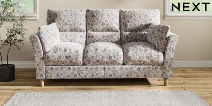 7.2.10 Buy Hartley Highback Relaxed Sit 3 Cushion 3 Seater Sofa Relaxed Linen Look Print Woodblock Floral Blue Low Conical - Light from the Next UK online shop Click here to use our accessible website