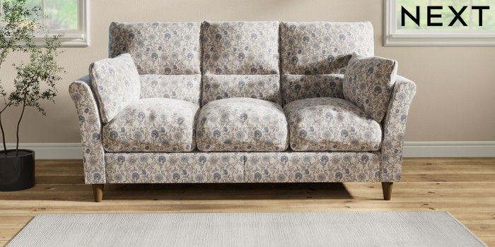 7.2.10 Buy Hartley Highback Relaxed Sit 3 Cushion 3 Seater Sofa Relaxed Linen Look Print Woodblock Floral Blue Low Conical - Mid from the Next UK online shop Click here to use our accessible website