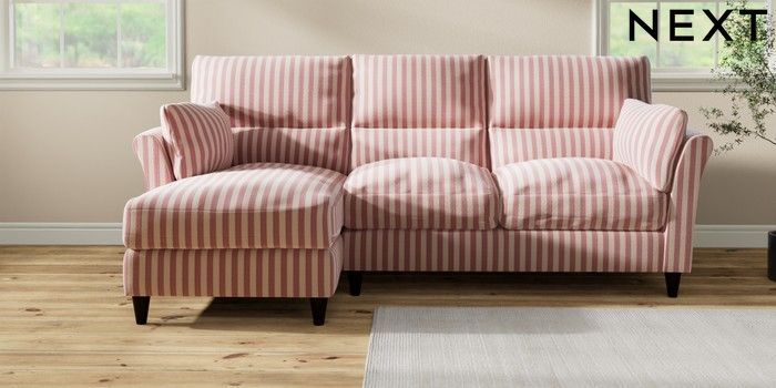 7.3.1 Buy Hartley Highback Relaxed Sit Medium Sofa Chaise - Left Hand Bold Chenille Stripe Dark Pink Low Conical - Dark from the Next UK online shop