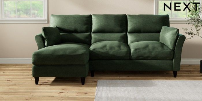 7.3.1 Buy Hartley Highback Relaxed Sit Medium Sofa Chaise - Left Hand Luxe Chenille Dark Green Low Conical - Dark from the Next UK online shop