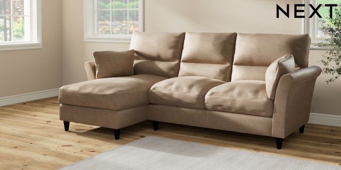7.2.10 Buy Hartley Highback Relaxed Sit Medium Sofa Chaise - Left Hand Luxe Chenille Mid Camel Beige Low Conical - Dark from the Next UK online shop Click here to use our accessible website