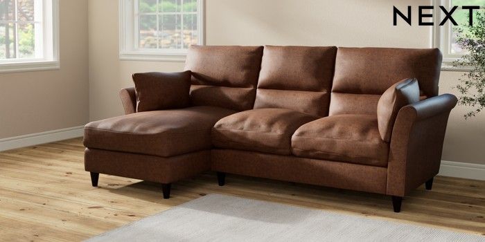 7.2.10 Buy Hartley Highback Relaxed Sit Medium Sofa Chaise - Left Hand Monza Faux Leather Easy Clean Chestnut Brown Low Conical - Dark from the Next UK online shop Click here to use our accessible website