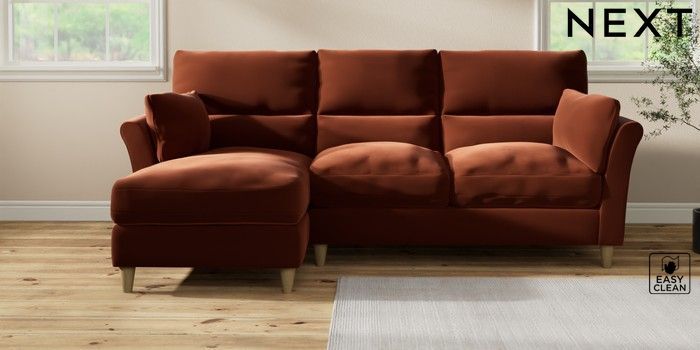 7.3.1 Buy Hartley Highback Relaxed Sit Medium Sofa Chaise - Left Hand Plush Velvet Easy Clean Ginger Orange Low Conical - Light from the Next UK online shop