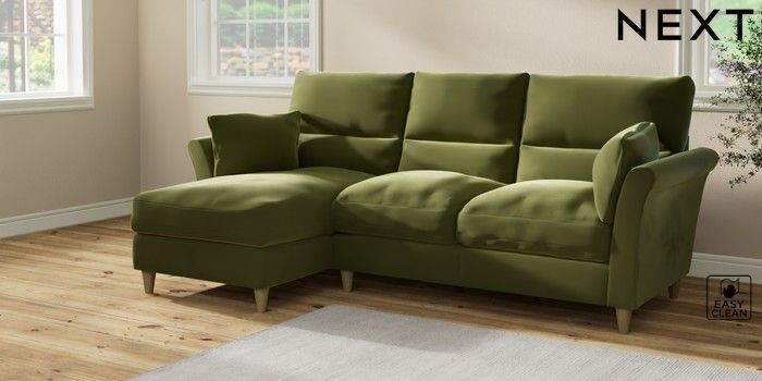 7.2.10 Buy Hartley Highback Relaxed Sit Medium Sofa Chaise - Left Hand Plush Velvet Easy Clean Mid Olive Green Low Conical - Light from the Next UK online shop Click here to use our accessible website