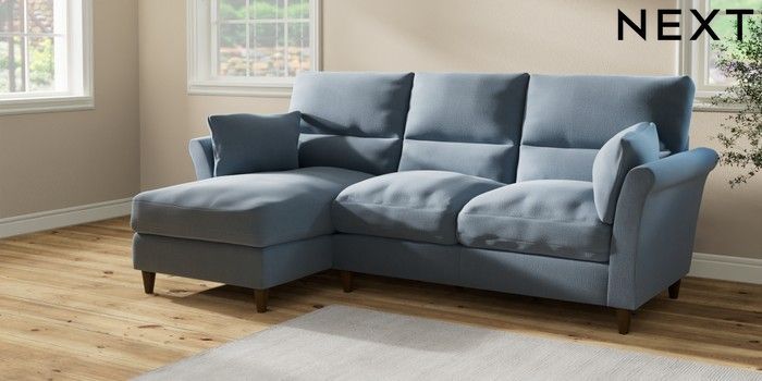 7.2.10 Buy Hartley Highback Relaxed Sit Medium Sofa Chaise - Left Hand Relaxed Linen Look Mid Blue Low Conical - Mid from the Next UK online shop Click here to use our accessible website