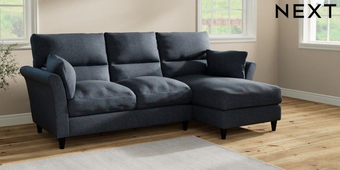 7.2.10 Buy Hartley Highback Relaxed Sit Medium Sofa Chaise - Right Hand Tweedy Chenille Navy Blue Low Conical - Dark from the Next UK online shop Click here to use our accessible website