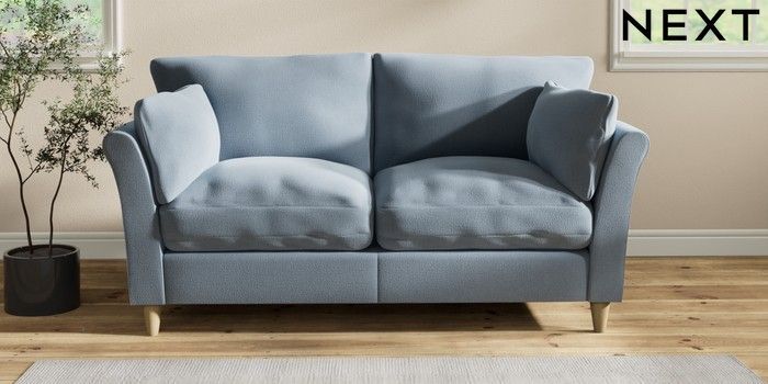 7.2.10 Buy Hartley Relaxed Sit 3 Seater Small Sofa Relaxed Linen Look Mid Blue Low Conical - Light from the Next UK online shop Click here to use our accessible website