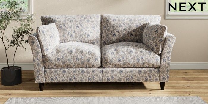 7.2.10 Buy Hartley Relaxed Sit 3 Seater Small Sofa Relaxed Linen Look Print Woodblock Floral Blue Low Conical - Dark from the Next UK online shop Click here to use our accessible website