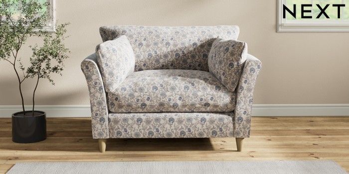7.2.10 Buy Hartley Relaxed Sit Love Seat Relaxed Linen Look Print Woodblock Floral Blue Low Conical - Light from the Next UK online shop Click here to use our accessible website