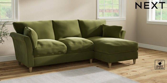 7.2.10 Buy Hartley Relaxed Sit Medium Sofa Chaise - Right Hand Plush Velvet Easy Clean Mid Olive Green Low Conical - Light from the Next UK online shop Click here to use our accessible website