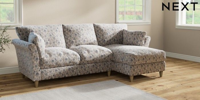 7.2.10 Buy Hartley Relaxed Sit Medium Sofa Chaise - Right Hand Relaxed Linen Look Print Woodblock Floral Blue Low Conical - Light from the Next UK online shop Click here to use our accessible website