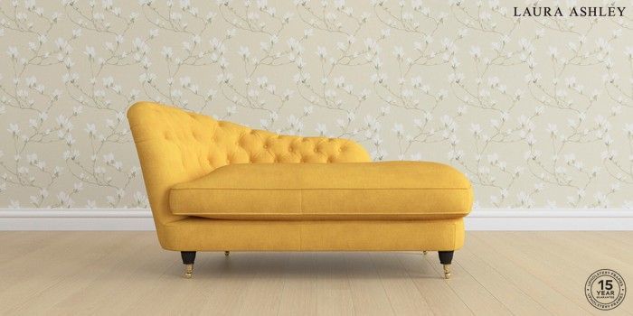 7.2.6 Buy Hathersage by Laura Ashley Chaise Longue Left Hand Bainton Ochre Yellow Low Brass Castor - Black from the Next UK online shop Click here to use our accessible website