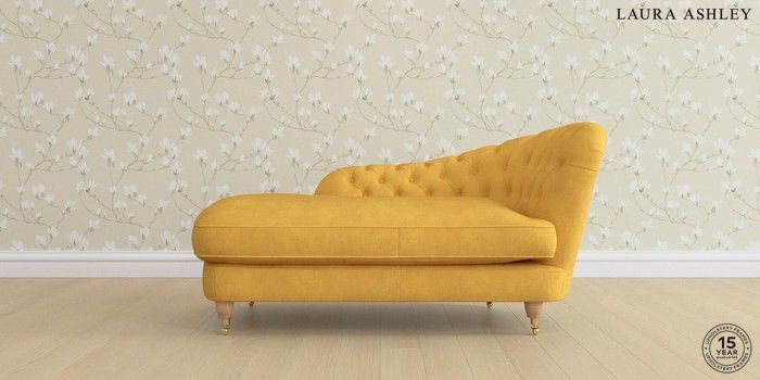 7.0.3 Buy Hathersage by Laura Ashley Chaise Longue Right Hand Bainton Ochre Yellow Low Brass Castor - Light Oak from the Next UK online shop Click here to use our accessible website