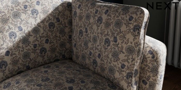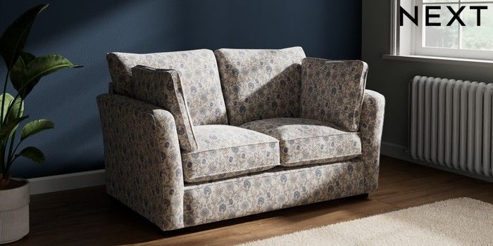 7.3.1 Buy Heath Highback 2 Seater Small Sofa Relaxed Linen Look Print Woodblock Floral Blue Block - Dark from the Next UK online shop Click here to use our accessible website