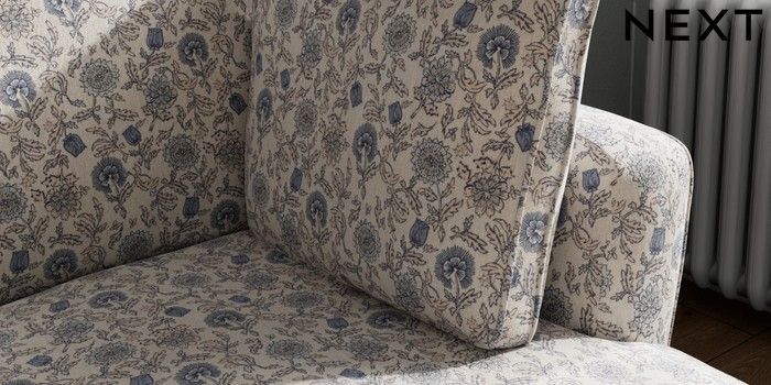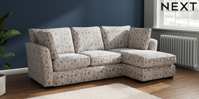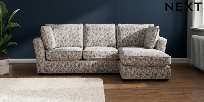 7.3.1 Buy Heath Highback Medium Sofa Chaise - Right Hand Relaxed Linen Look Print Woodblock Floral Blue Block - Dark from the Next UK online shop Click here to use our accessible website