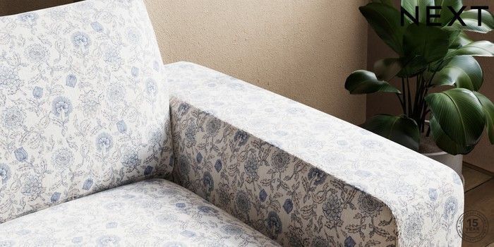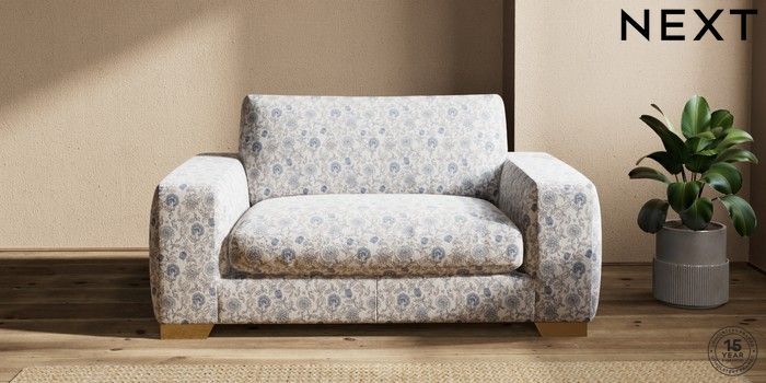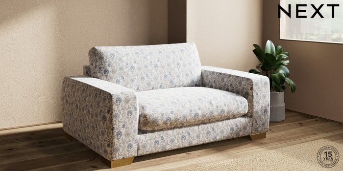 7.3.1 Buy Houghton Deep Relaxed Sit 2 Seater Small Sofa Relaxed Linen Look Print Woodblock Floral Blue Large Square Angle - Brushed Brass from the Next UK online shop Click here to use our accessible website