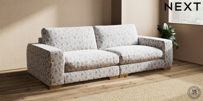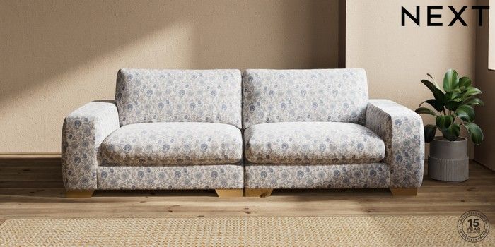 7.3.1 Buy Houghton Deep Relaxed Sit 4 Seater Sofa Relaxed Linen Look Print Woodblock Floral Blue Large Square Angle - Brushed Brass from the Next UK online shop Click here to use our accessible website