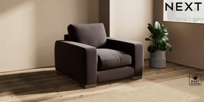 6.12.1 Buy Houghton Deep Relaxed Sit Armchair Fine Chenille Easy Clean Chocolate Brown Large Square Angle - Gunmetal from the Next UK online shop Click here to use our accessible website