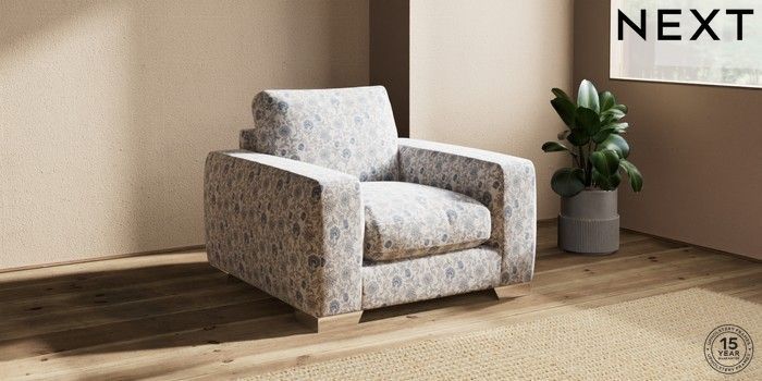 7.3.1 Buy Houghton Deep Relaxed Sit Armchair Relaxed Linen Look Print Woodblock Floral Blue Large Square Angle - Chrome Metal from the Next UK online shop