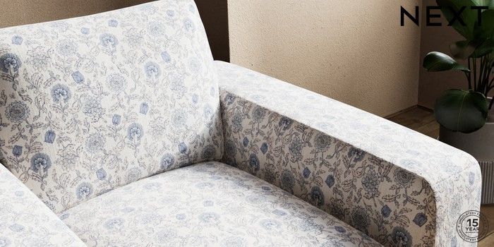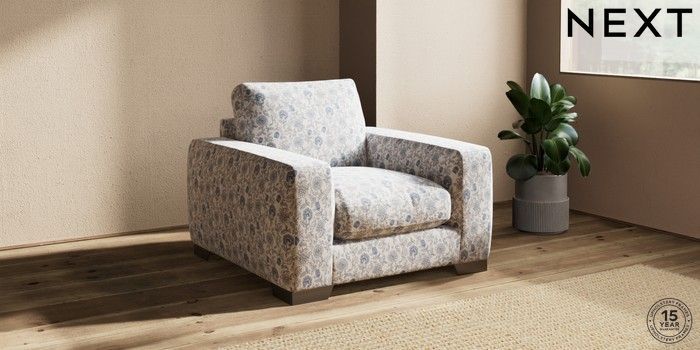 7.3.1 Buy Houghton Deep Relaxed Sit Armchair Relaxed Linen Look Print Woodblock Floral Blue Large Square Angle - Gunmetal from the Next UK online shop