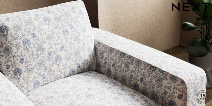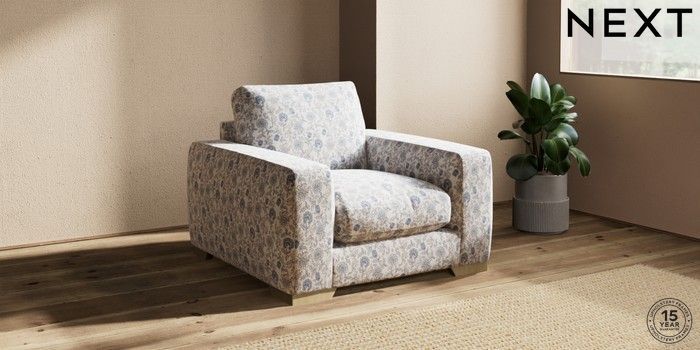 7.3.1 Buy Houghton Deep Relaxed Sit Armchair Relaxed Linen Look Print Woodblock Floral Blue Large Square Angle - Light from the Next UK online shop Click here to use our accessible website