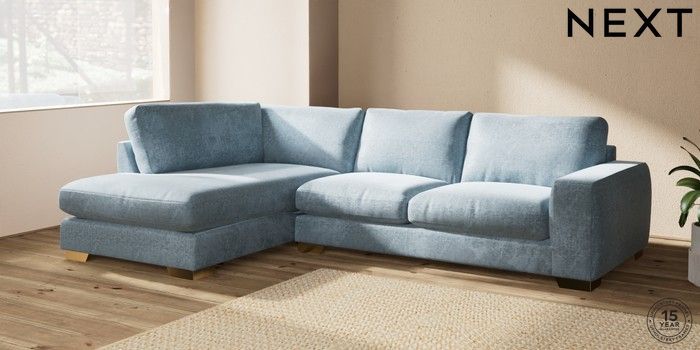 7.2.6 Buy Houghton Deep Relaxed Sit Large Corner Chaise - Left Hand Plush Chenille Light Blue Large Square Angle - Brushed Brass from the Next UK online shop Click here to use our accessible website