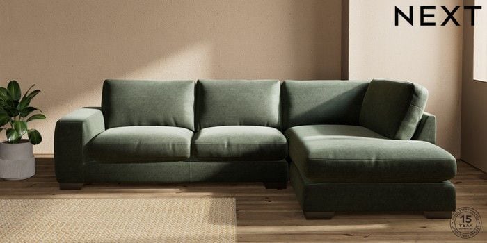 7.0.3 Buy Houghton Deep Relaxed Sit Large Corner Chaise - Right Hand Luxe Chenille Mid Green Large Square Angle - Gunmetal from the Next UK online shop Click here to use our accessible website