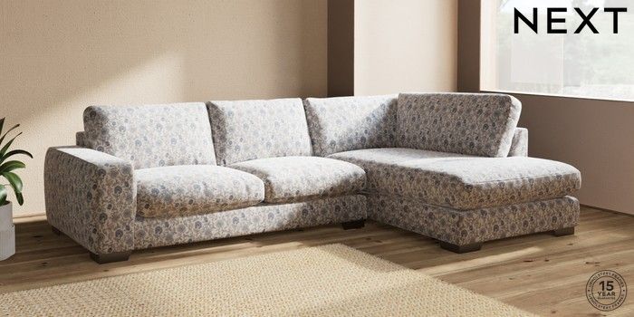 7.3.1 Buy Houghton Deep Relaxed Sit Large Corner Chaise - Right Hand Relaxed Linen Look Print Woodblock Floral Blue Large Square Angle - Gunmetal from the Next UK online shop