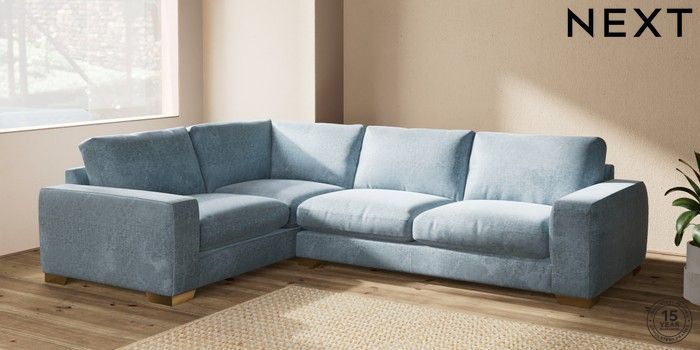7.2.6 Buy Houghton Deep Relaxed Sit Large Corner Sofa - Left Hand Plush Chenille Light Blue Large Square Angle - Brushed Brass from the Next UK online shop Click here to use our accessible website