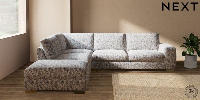 7.3.1 Buy Houghton Deep Relaxed Sit Large Open End Corner Chaise - Left Hand Relaxed Linen Look Print Woodblock Floral Blue Large Square Angle - Brushed Brass from the Next UK online shop Click here to use our accessible website