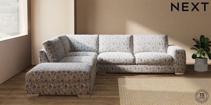7.3.1 Buy Houghton Deep Relaxed Sit Large Open End Corner Chaise - Left Hand Relaxed Linen Look Print Woodblock Floral Blue Large Square Angle - Chrome Metal from the Next UK online shop Click here to use our accessible website