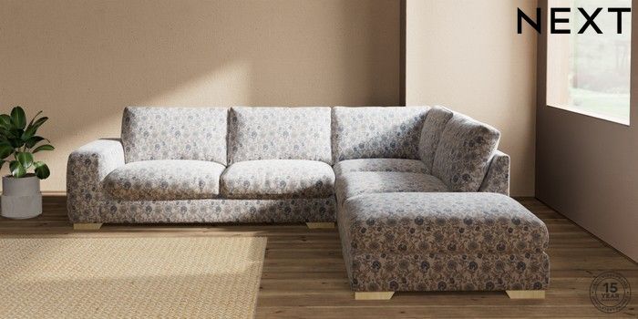 7.3.1 Buy Houghton Deep Relaxed Sit Large Open End Corner Chaise - Right Hand Relaxed Linen Look Print Woodblock Floral Blue Large Square Angle - Light from the Next UK online shop Click here to use our accessible website