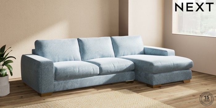7.2.6 Buy Houghton Deep Relaxed Sit Large Sofa Chaise - Right Hand Plush Chenille Light Blue Large Square Angle - Brushed Brass from the Next UK online shop Click here to use our accessible website