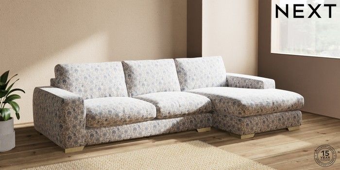 7.3.1 Buy Houghton Deep Relaxed Sit Large Sofa Chaise - Right Hand Relaxed Linen Look Print Woodblock Floral Blue Large Square Angle - Light from the Next UK online shop Click here to use our accessible website