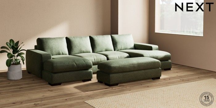 7.2.6 Buy Houghton Deep Relaxed Sit Large - U Shaped Double Chaise with Footstool Boucle Chenille Dark Moss Green Large Square Angle - Dark from the Next UK online shop Click here to use our accessible website