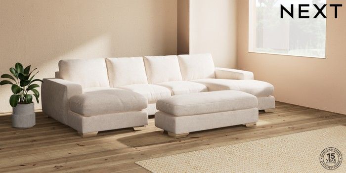 7.2.6 Buy Houghton Deep Relaxed Sit Large - U Shaped Double Chaise with Footstool Boucle Chenille Oyster Large Square Angle - Chrome Metal from the Next UK online shop Click here to use our accessible website